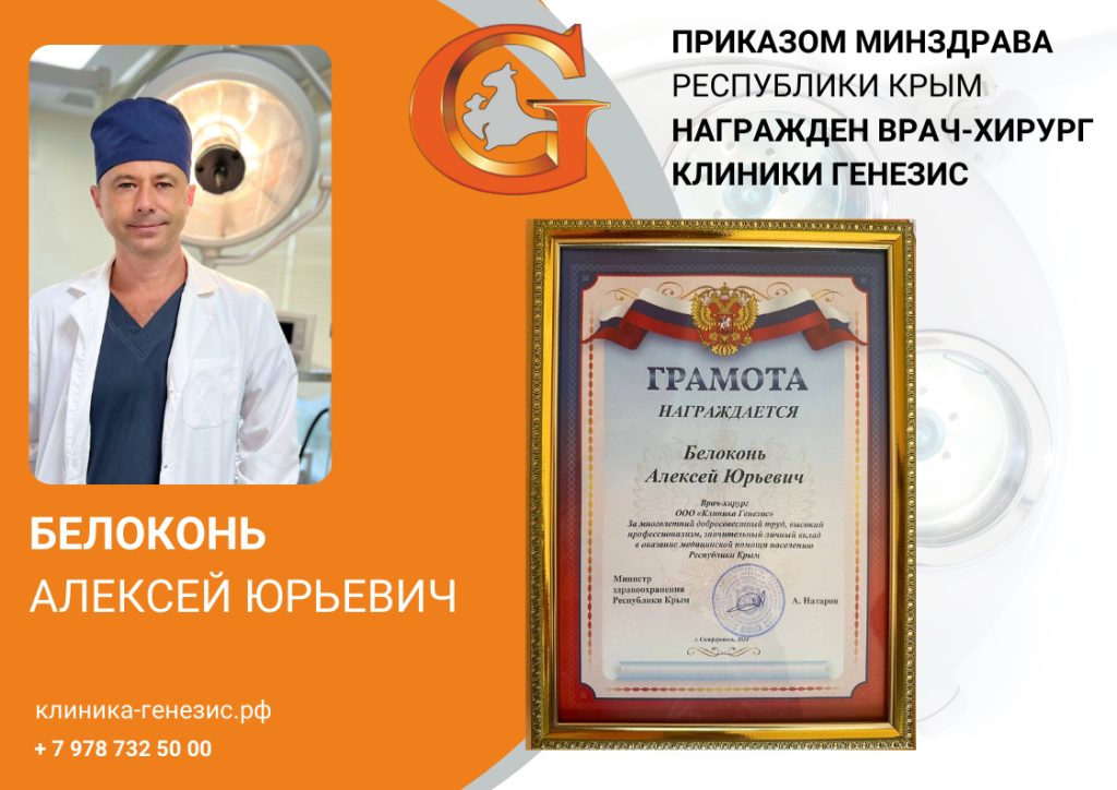 Кандидату медицинских наук, хирургу высшей категории клиники ГЕНЕЗИС Белоконю Алексею Юрьевичу присвоено почетное звание «Заслуженный врач Республики Крым» за значительный вклад в развитие здравоохран...