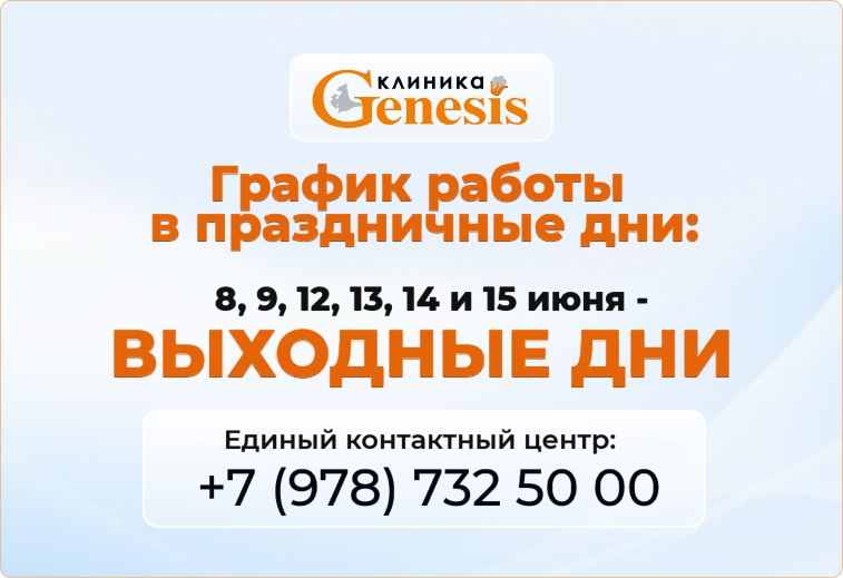 График работы Клиники Генезис в мае. 1, 2, 3, 4, 8, 9, 10, 11 мая — выходные дни. В остальные дни клиника работает согласно расписанию. Единый контактный центр: 📞 +7 (978) 732 50 00..