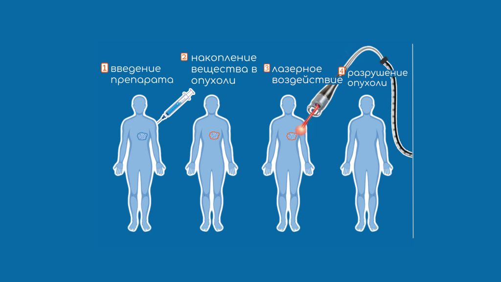 Пациенту вводится специальный препарат, который избирательно накапливается в опухолевых клетках. В присутствии кислорода тканей, его введение приводит к развитию фотохимической реакции, разрушающей очаг злокачественного образования. Дополнительно на опухоль направляется определенное лазерное воздействие специальной длины волны с заданной интенсивностью и плотностью дозы на единицу площади поверхности.